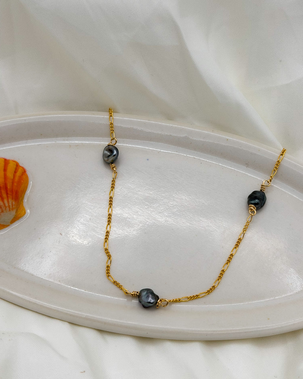 Embrace the ethereal beauty of the Keshi Drop Necklace. Adorned with exquisite Keshi Tahitian pearls, this 14k gold fill figaro chain necklace exudes elegance and grace. Fearlessly make a statement...